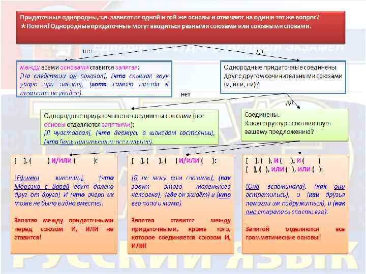В сложноподчиненных предложениях с несколькими однородными придаточными знаки препинания ставятся по правилам, действующим при отделении однородных членов простого предложения: учитывается, соединяются придаточные части сочинительными союзами или не соединяются, повторяется сочинительный союз или не повторяется; имеет значение и число повторяющихся сочинительных союзов. 1. Между однородными придаточными, не соединенными сочинительными союзами, ставится запятая: Я помню, как мы бежали по лесу, как жужжали пули, как падали отрываемые ими ветки, как мы продирались сквозь кусты боярышника (Гарш. ) — четыре придаточные части изъяснительные, не соединенные сочинительными союзами. 2. Между двумя придаточными, соединенными одиночными соединительными или разделительными союзами и, или, либо, да (в значении «и» ), запятая не ставится (при этом подчинительный союз или союзное слово может и не повторяться): Подходя к дому, я вспомнил, что неподалеку в еловом перелеске с можжевельником не раз спугивал старого петуха-черныша и еще там жила матка с одним молодым петушком (Пришв. ) — две придаточные части изъяснительные, соединенные союзом и; Точь-в-точь такую же жалость вызывала у нее и мать, Зинаида Витальевна, когда, забыв про своих продавщиц, парикмахерш и массажисток, усталая, укладывалась на ночлег или когда учила девочку завязывать бантики (Бел. ) — две придаточные части времени, соединенные союзом или.