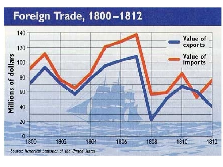 Using the graph & information from 10. 3, explain why the War of 1812 was the “second war for independence” not politically, but for economic independence: • graph shows increasing trade 1804 1807 • war between -Britain & France disrupted U. S. trade • British impressed U. S. sailors • Embargo Act, 1807 attempted to end conflict but did more harm than good as the graph shows • many Americans demanded war to stop British interference & restore economic liberty