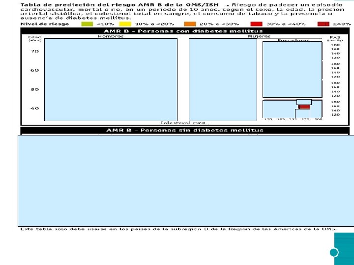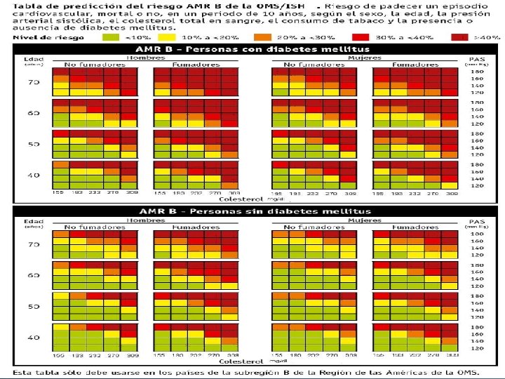 ¿Cómo deben utilizarse las tablas para determinar el riesgo cardiovascular? Antes de usar la tabla para estimar el riesgo cardiovascular a 10 años de un individuo, se debe recopilar la siguiente información: l Presencia o ausencia de diabetes Sexo Fumador o no fumador Edad Presión arterial sistólica l Colesterol total en sangre en Mg/d. L l l