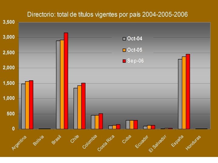 Títulos vigentes Directorio 2006 Enero Feb. Marzo Abril Mayo Junio Jul/Ago Sept. 0 * 1 0 1 2 2 2 Argentina 1, 559 * 1, 587 1, 595 Bahamas 3 * 3 3 3 Barbados 10 * 10 10 10 Belice 1 * 1 1 1 Bolivia 19 * 19 19 19 Brasil 2, 993 * 3, 132 3, 141 3, 154 3, 155 3, 162 3, 163 Chile 1, 440 * 1, 467 1, 472 1, 477 1, 481 1, 503 Colombia 459 * 468 488 504 504 Costa Rica 129 * 142 142 145 Cuba 291 * 291 291 291 292 Ecuador 123 * 124 124 124 El Salvador 22 * 22 22 22 2, 381 * 2, 407 2, 414 2, 425 2, 438 2, 454 2, 461 Guatemala 34 * 34 34 34 Guyana 2 * 2 2 2 Antigua y Barbuda España