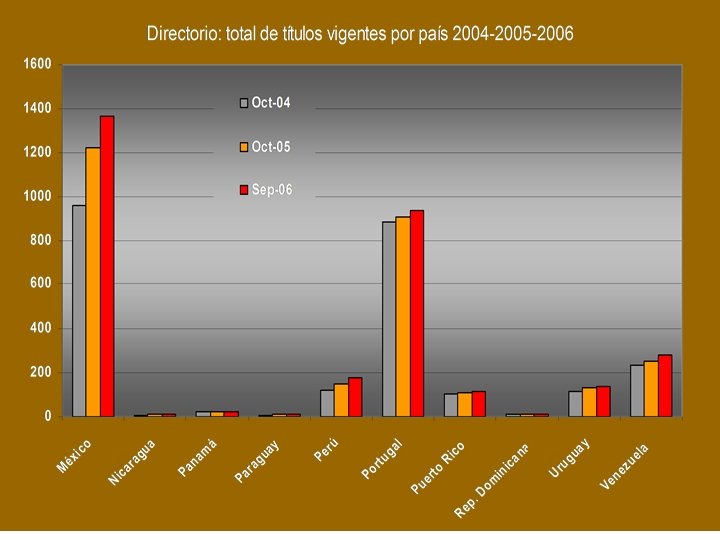 Títulos vigentes Directorio 2006 Enero Feb. Marzo Abril Mayo Junio Jul/Ago Septiembre Haití 1 * 1 1 1 Honduras 9 * 9 9 9 Jamaica 8 * 8 8 8 México 1, 315 * 1, 325 1, 330 1, 338 1, 356 1, 358 1, 364 Nicaragua 9 * 9 9 9 Organismos Int. 39 * 41 41 41 46 Panamá 25 * 25 25 25 Paraguay 9 * 9 9 9 Perú 159 * 162 163 166 179 Portugal 922 * 925 927 930 932 934 Puerto Rico 111 * 115 115 115 116 República Dominicana 14 * 14 14 14 Trinidad y Tobago 10 * 10 10 10 Uruguay 136 * 136 136 137 Venezuela 255 * 257 263 266 272 276 279 12, 488 12, 756 12, 790 12, 854 12, 918 12, 993 13, 020 Totales mensuales