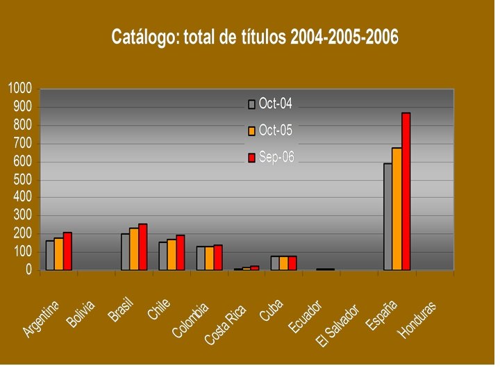 Títulos Catálogo 2006 Enero Feb. Marzo Abril Mayo Junio Argentina 178 * 186 187 187 203 206 Barbados 1 * 1 1 1 Bolivia 2 * 2 2 2 Brasil 237 * 245 249 252 255 257 Chile 179 * 181 184 185 193 Colombia 137 * 131 136 142 143 Costa Rica 18 * 20 20 20 22 23 23 Cuba 80 * 80 80 80 Ecuador 8 * 8 9 9 9 España 688 * 747 774 794 837 859 865 Jamaica 1 * 1 1 1 México 256 * 258 260 262 265 273 280 Nicaragua Organismos Internacionales 1 * 1 1 1 2 * 2 2 2 3 Panamá 1 * 1 1 1 Perú 35 * 35 35 35 36 38 38 Portugal 83 * 86 86 88 90 91 91 Puerto Rico 26 * 27 27 27 República Dominicana 1 * 1 1 1 Uruguay 6 * 6 6 6 111 * 111 112 117 119 110 106 2, 051 * 2, 130 2, 169 2, 206 2, 266 2, 319 2, 334 Venezuela Totales mensuales Jul/Ago Septiembre