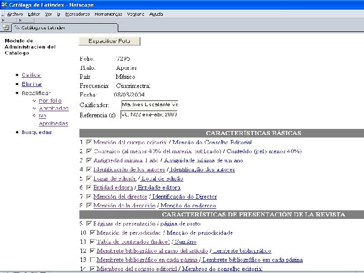 Para la inclusión de revistas en el Catálogo Latindex, se elaboró una batería de 33 características editoriales de calidad seleccionadas, después de diversas pruebas piloto con casi un centenar de revistas en seis de los países participantes, así como de diversas, reuniones técnicas de Latindex celebradas en 2001 (Lisboa y Buenos Aires) y 2002 (San Juan, Puerto Rico).
