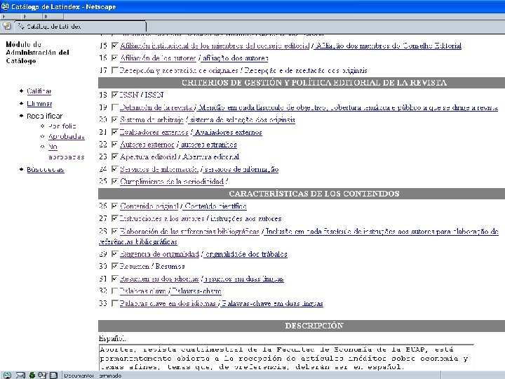Características de los contenidos (8) Características de gestión y política editorial (8) 18. - ISSN 19. -Definición de la revista 20. - Sistema de arbitraje 21. - Evaluadores externos 22. - Autores externos 23. - Apertura editorial 24. - Servicios de información 25. - Cumplimiento de periodicidad 26. - Contenido original 27. - Instrucciones a los autores 28. - Elaboración de las referencias bibliográficas 29. - Exigencia de originalidad 30. - Resumen 31. - Resumen en dos idiomas 32. - Palabras clave 33. - Palabras clave en dos idiomas