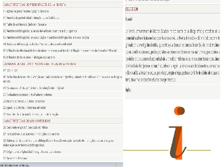 Criterios de calidad: formales y de contenido Criterios de calidad formal: n Normas de presentación n Periodicidad y pervivencia n Composición de los Consejos de Redacción n Proceso de evaluación de originales n Procedencia institucional de los autores n Apertura institucional