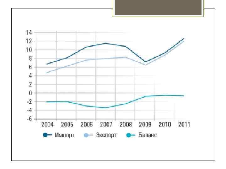 2011 год экспортировано товаров на 12 млрд. евро, что по сравнению с предыдущим годом на 3, 3 млрд. евро или на 38% больше импортировано – на 12, 6 млрд. евро, что составляет прирост на 3, 3 млрд. евро или на 37%. Дефицит Эстонской торговли в 2011 году достиг 0, 6 млрд. евро, что на 0, 1 млрд. евро больше чем в 2010 году.