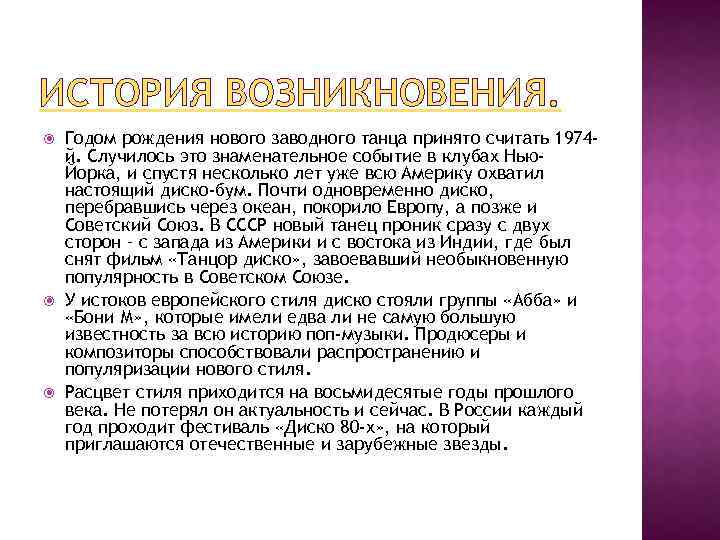 ИСТОРИЯ ВОЗНИКНОВЕНИЯ. Годом рождения нового заводного танца принято считать 1974 й. Случилось это знаменательное событие в клубах Нью. Йорка, и спустя несколько лет уже всю Америку охватил настоящий диско-бум. Почти одновременно диско, перебравшись через океан, покорило Европу, а позже и Советский Союз. В СССР новый танец проник сразу с двух сторон – с запада из Америки и с востока из Индии, где был снят фильм «Танцор диско» , завоевавший необыкновенную популярность в Советском Союзе. У истоков европейского стиля диско стояли группы «Абба» и «Бони М» , которые имели едва ли не самую большую известность за всю историю поп-музыки. Продюсеры и композиторы способствовали распространению и популяризации нового стиля. Расцвет стиля приходится на восьмидесятые годы прошлого века. Не потерял он актуальность и сейчас. В России каждый год проходит фестиваль «Диско 80 -х» , на который приглашаются отечественные и зарубежные звезды.