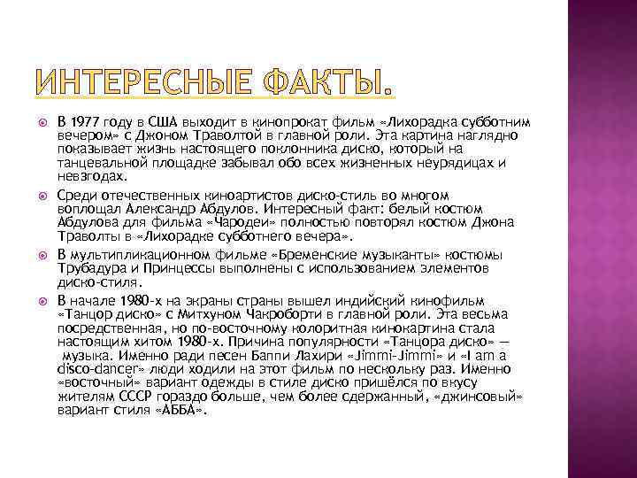 ИНТЕРЕСНЫЕ ФАКТЫ. В 1977 году в США выходит в кинопрокат фильм «Лихорадка субботним вечером» с Джоном Траволтой в главной роли. Эта картина наглядно показывает жизнь настоящего поклонника диско, который на танцевальной площадке забывал обо всех жизненных неурядицах и невзгодах. Среди отечественных киноартистов диско-стиль во многом воплощал Александр Абдулов. Интересный факт: белый костюм Абдулова для фильма «Чародеи» полностью повторял костюм Джона Траволты в «Лихорадке субботнего вечера» . В мультипликационном фильме «Бременские музыканты» костюмы Трубадура и Принцессы выполнены с использованием элементов диско-стиля. В начале 1980 -х на экраны страны вышел индийский кинофильм «Танцор диско» с Митхуном Чакроборти в главной роли. Эта весьма посредственная, но по-восточному колоритная кинокартина стала настоящим хитом 1980 -х. Причина популярности «Танцора диско» — музыка. Именно ради песен Баппи Лахири «Jimmi-Jimmi» и «I am a disco-dancer» люди ходили на этот фильм по нескольку раз. Именно «восточный» вариант одежды в стиле диско пришёлся по вкусу жителям СССР гораздо больше, чем более сдержанный, «джинсовый» вариант стиля «АББА» .