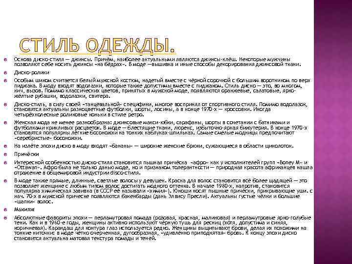 СТИЛЬ ОДЕЖДЫ. Основа диско-стиля — джинсы. Причём, наиболее актуальными являются джинсы-клёш. Некоторые мужчины позволяют себе носить джинсы «на бёдрах» . В моде —вышивка и иные способы декорирования джинсовой ткани. Диско-ролики Особым шиком считается белый мужской костюм, надетый вместе с чёрной сорочкой с большим воротником по верх пиджака. В моду входят водолазки, которые также допустимы вместе с пиджаком. Стиль диско — это, во многом, кич, вызов. Помимо классических цветов, принятых в мужской моде, появляются оранжевые, салатовые, яркожёлтые рубашки, водолазки, свитера. Диско-стиль, в силу своей «танцевальной» специфики, многое воспринял от спортивного стиля. Помимо водолазок, становятся актуальны разноцветные футболки, шорты, лосины, а в конце 1970 -х — кроссовки. Иногда четырёхколесные роликовые коньки в стиле ретро. Женская мода не менее разнообразна: джинсовые макси-юбки, сарафаны, шорты в сочетании с батниками и футболками крикливых расцветок. В моде — блестящие ткани, люрекс, избыточно-яркая бижутерия. В конце 1970 -х становятся популярны лёгкие босоножки на тонких каблуках-шпильках. Самые смелые модницы предпочитают «серебристые» босоножки. На излёте эпохи диско в моду входят «бананы» — широкие женские брюки, сужающиеся в области щиколоток. Причёски Интересной особенностью диско-стиля становится пышная причёска «афро» как у исполнителей групп «Boney M» и «Ottawan» . Афро была не только данью моде, но и признаком толерантности — природная красота африканцев нашла отражение в общемировой индустрии disco-стиля. В моде также прямые, длинные, светлые волосы у девушек. Краска для волос становится всё более щадящей — это позволяет женщине с любым типом волос достигать модного оттенка. В начале 1980 -х, напротив, становится популярна химическая завивка (в СССР её называли «химия» ). Юноши носят пышные причёски, прикрывающие уши. с нач. 70 -х в мужской прическе появляются бакенбарды (дань Элвису Пресли). Актуальны густые чёлки и большие «шапки» волос. Макияж Абсолютные фавориты эпохи — перламутровая помада (розовая, красная, малиновая) и перламутровые ярко-голубые тени. Как и в 1960 -е годы, женщины активно используют чёрную тушь для ресниц (хотя, допустима и синяя, коричневая). Карандаш для контура глаз используется редко. Женщины выщипывают брови, делая их похожими на тонкие ниточки: в моде чётко очерченная, дугообразная, «удивлённо приподнятая» бровь. К концу эпохи диско становится актуальна матовая текстура помады и теней.