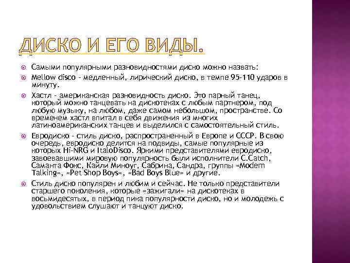 ДИСКО И ЕГО ВИДЫ. Самыми популярными разновидностями диско можно назвать: Mellow disco – медленный, лирический диско, в темпе 95 -110 ударов в минуту. Хастл – американская разновидность диско. Это парный танец, который можно танцевать на дискотеках с любым партнером, под любую музыку, на любом, даже самом небольшом, пространстве. Со временем хастл впитал в себя движения из многих латиноамериканских танцев и выделился с самостоятельный стиль. Евродиско – стиль диско, распространенный в Европе и СССР. В свою очередь, евродиско делится на подвиды, самые популярные из которых Hi-NRG и Italo. Disco. Яркими представителями евродиско, завоевавшими мировую популярность были исполнители C. Catch, Саманта Фокс, Кайли Миноуг, Сабрина, Сандра, группы «Modern Talking» , «Pet Shop Boys» , «Bad Boys Blue» и другие. Стиль диско популярен и любим и сейчас. Не только представители старшего поколения, которые «зажигали» на дискотеках в восьмидесятых, в период пика популярности диско, но и молодежь с удовольствием слушают и танцуют диско.