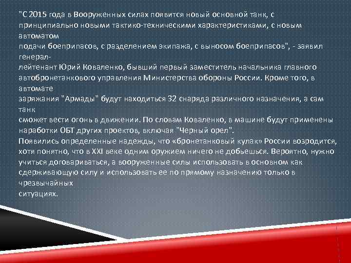 "С 2015 года в Вооруженных силах появится новый основной танк, с принципиально новыми тактико-техническими характеристиками, с новым автоматом подачи боеприпасов, с разделением экипажа, с выносом боеприпасов", - заявил генераллейтенант Юрий Коваленко, бывший первый заместитель начальника главного автобронетанкового управления Министерства обороны России. Кроме того, в автомате заряжания "Армады" будут находиться 32 снаряда различного назначения, а сам танк сможет вести огонь в движении. По словам Коваленко, в машине будут применены наработки ОБТ других проектов, включая "Черный орел". Появились определенные надежды, что «бронетанковый кулак» России возродится, хотя понятно, что в XXI веке одним оружием ничего не добьешься. Вероятно, нужно учиться договариваться, а вооруженные силы использовать в основном как сдерживающую силу и использовать ее по прямому назначению только в чрезвычайных ситуациях.