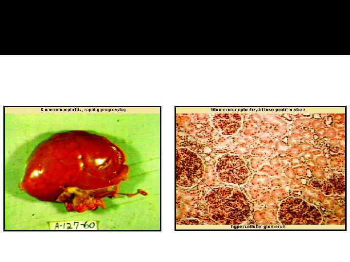 Проявления Почка, пораженная гломерулонефритом Симптоматика в основном совпадает при остром гломерулонефрите. Однако в отличие от острого, для хронического гломерулонефрита характерно волнообразное течение, когда периоды ремиссии сменяются обострениями. Отмечается неуклонное, более или менее быстрое прогрессирование заболевания, приводящее в конечном итоге к развитию хронической почечной недостаточности.