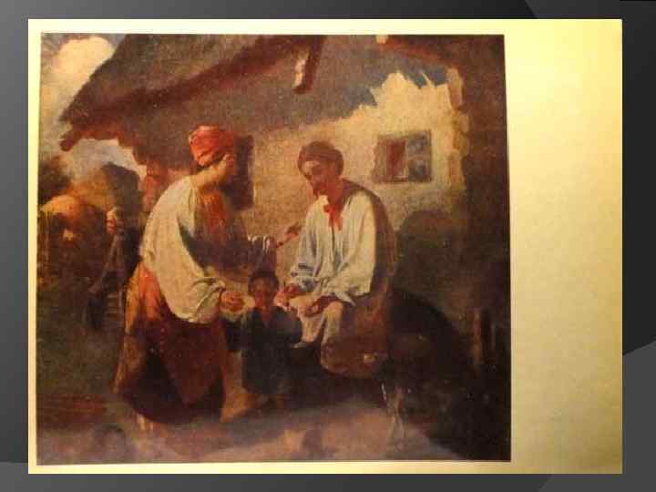 ДИТИНСТВО ТАРАСА Дитячі роки Тараса проходять у селі Кирилівці. Був такий випадок, коли малий Тарас пішов шукати «залізні стовпи» , що «підпирають» небо, і заблудився в полі. Чумаки, зустрівши хлопця, забрали його з собою і ввечері привезли в Кирилівку. Восени 1822 року Тарас Шевченко починає вчитися грамоти у місцевого дяка Совгиря. Знайомиться з творами Г. Сковороди. В період 1822 -1828 років намалював «Коні. Солдати» (картина не знайдена).