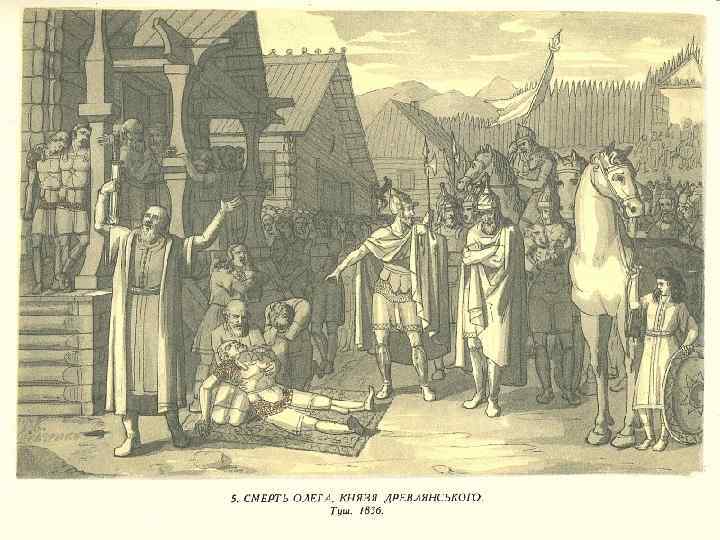 Сюжетом для малюнка послужив епізод міжусобної боротьби з історії Київської Русі — загибель древлянського князя Олега 977 р. під час нападу на нього його брата, київського князя Ярополка, підмовленого на це воєводою Свінельдом. Зміст і деталі малюнка збігаються з описом закінчення походу Ярополка в «Истории государства Российского» М. М. Карамзіна: «Победитель, видя бездушный, окровавленный труп Олегов, лежащий на ковре перед его глазами, забыл свое торжество, слезами изъявил раскаяние и, с горестию указывая на мертвого, сказал Свенельду: «Того ли хотелось тебе? . . »