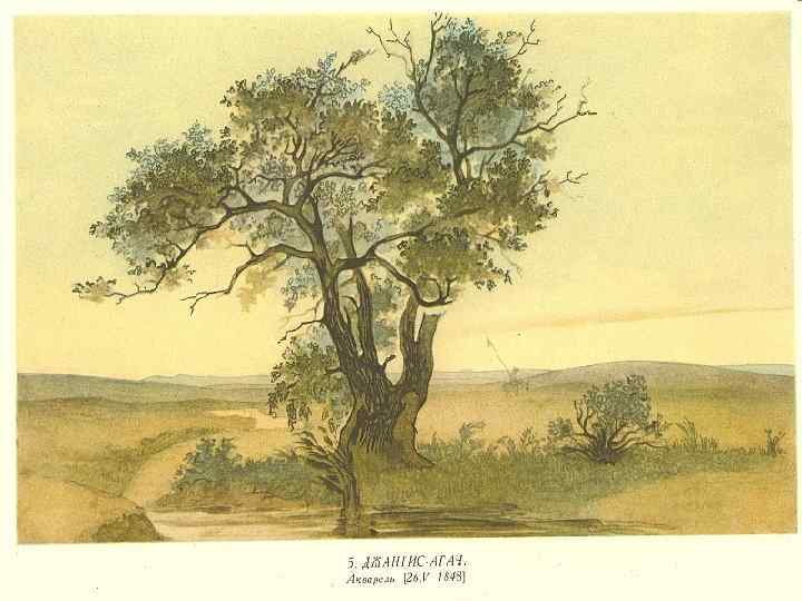 Про дерево джангис-агач, або жангиз-агаш (що означає «одиноке дерево» ), Шевченко розповідає в повісті «Близнецы» : «. . . верстах в двух от дороги, в ложбине, зеленело тополевое старое дерево. Я застал уже вокруг него порядочную [толпу], с удивлением и даже (так мне казалося) с благоговением смотревшую на зеленую гостью пустыни. Вокруг дерева и на ветках его навешано набожными киргизами кусочки разноцветных материй, ленточки, пасма крашеных лошадиных волос и самая богатая жертва — это шкура дикой кошки, крепко привязанная к ветке. . . »