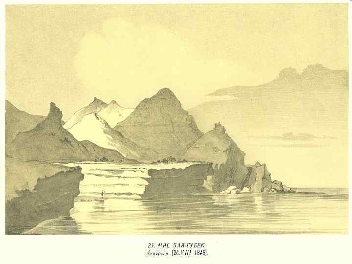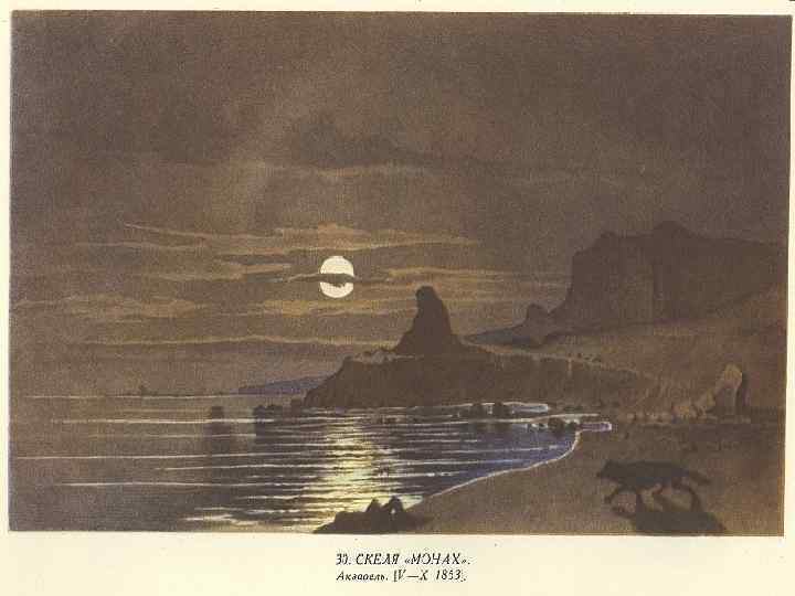Офорт за малюнком Шевченка та опис зображеної місцевості Бр. Залеський вмістив у своєму альбомі: «Недалеко від Новопетровського рейду, на кам’янистому крутому березі моря, піднімається скеля «Монах» в вісімдесят футів висотою, названа так через свою форму. Вона стоїть як кам’яний сторож пустелі. її оточують лише розкидані поодинці скелі, а біля підніжжя її вічно реве море. Мешканці укріплення, позбавлені протягом усієї зими будь-яких засобів сполучення з західним узбережжям Каспію і прагнучи дізнатися, що нового діється на білому світі, з приходом весни, як тільки зникне лід, що сковує море, вибираються на вершину «Монаха» і з нетерпінням виглядають на обрії перший парус. Звідсіля вони легко його помітять, тому що «Монах» панує над іншими скелями цього узбережжя, але ні одно судно, навіть маленький човен, не пристане до підніжжя скелі, так багато підводного каміння в оточуючих її водах» . Мабуть, акварель була куплена самим А. Венгржиновським, тому що в листі від 8 листопада 1854 р. до Бр. Залеського Шевченко писав: «. . . целую трижды доброго Аркадия. Насчет Монаха напиши ему, чтобы он не беспокоился, деньги у меня пока еще имеются»