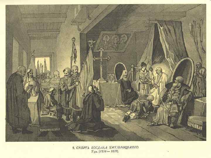 КАРТИНА “Смерть Богдана Хмельницького На малюнку зображено момент передачі вмираючим Богданом Хмельницьким гетьманської булави своєму синові Юрію. Зміст і деталі малюнка відповідають опису цієї події у відомій на той час Шевченкові історичній літературі і народній думі про смерть Хмельницького.