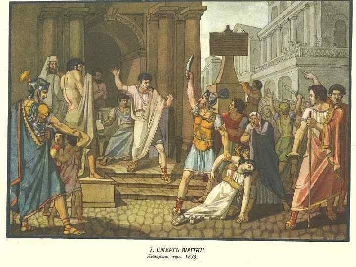 Картина “Смерть Віргінії” Сюжет малюнка взято з історії стародавнього Риму. Віргінія (V ст. до н. е. ) — дочка плебея Люція Віргінія. Один з децемвірів, Аппій Клавдій, щоб оволодіти Віргінією, об’явив її рабинею свого клієнта Марка Клавдія. Батько Віргінії вбив свою дочку, щоб врятувати її від рабства. Закликане до повстання плебеєм Віргінієм римське військо повалило владу децемвірів.