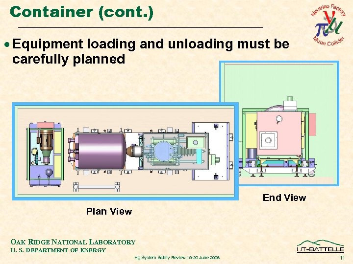 Container (cont. ) · Equipment loading and unloading must be carefully planned End View Plan View OAK RIDGE NATIONAL LABORATORY U. S. DEPARTMENT OF ENERGY Hg System Safety Review 19 -20 June 2006 11