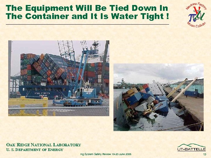 The Equipment Will Be Tied Down In The Container and It Is Water Tight ! OAK RIDGE NATIONAL LABORATORY U. S. DEPARTMENT OF ENERGY Hg System Safety Review 19 -20 June 2006 13