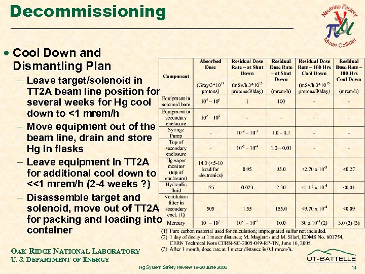 Decommissioning · Cool Down and Dismantling Plan - Leave target/solenoid in TT 2 A beam line position for several weeks for Hg cool down to <1 mrem/h - Move equipment out of the beam line, drain and store Hg in flasks - Leave equipment in TT 2 A for additional cool down to <<1 mrem/h (2 -4 weeks ? ) - Disassemble target and solenoid, move out of TT 2 A for packing and loading into container OAK RIDGE NATIONAL LABORATORY U. S. DEPARTMENT OF ENERGY Hg System Safety Review 19 -20 June 2006 14