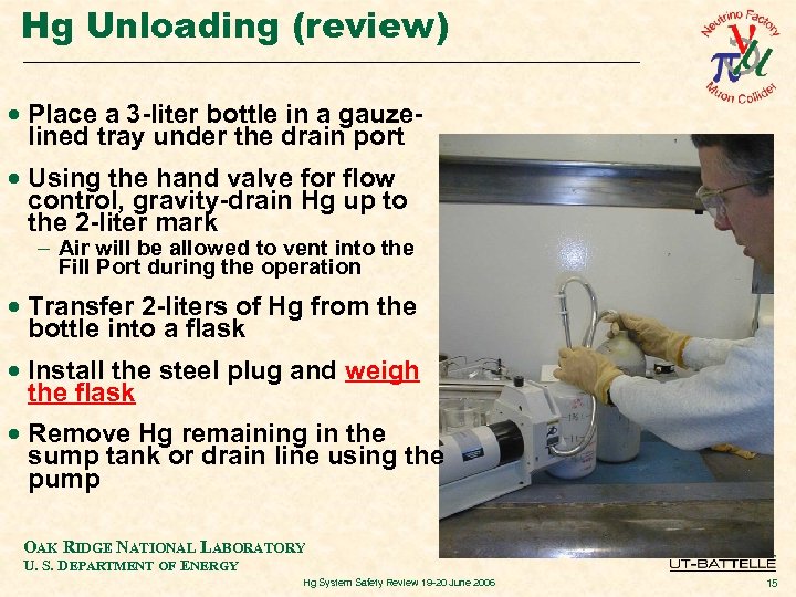 Hg Unloading (review) · Place a 3 -liter bottle in a gauzelined tray under the drain port · Using the hand valve for flow control, gravity-drain Hg up to the 2 -liter mark - Air will be allowed to vent into the Fill Port during the operation · Transfer 2 -liters of Hg from the bottle into a flask · Install the steel plug and weigh the flask · Remove Hg remaining in the sump tank or drain line using the pump OAK RIDGE NATIONAL LABORATORY U. S. DEPARTMENT OF ENERGY Hg System Safety Review 19 -20 June 2006 15