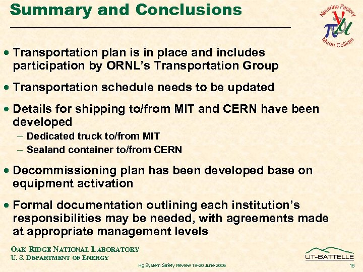 Summary and Conclusions · Transportation plan is in place and includes participation by ORNL’s Transportation Group · Transportation schedule needs to be updated · Details for shipping to/from MIT and CERN have been developed - Dedicated truck to/from MIT - Sealand container to/from CERN · Decommissioning plan has been developed base on equipment activation · Formal documentation outlining each institution’s responsibilities may be needed, with agreements made at appropriate management levels OAK RIDGE NATIONAL LABORATORY U. S. DEPARTMENT OF ENERGY Hg System Safety Review 19 -20 June 2006 16