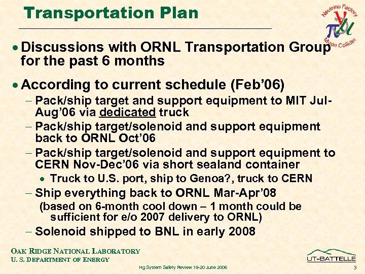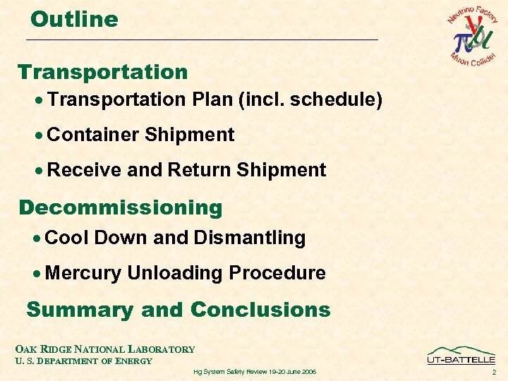 Outline Transportation · Transportation Plan (incl. schedule) · Container Shipment · Receive and Return Shipment Decommissioning · Cool Down and Dismantling · Mercury Unloading Procedure Summary and Conclusions OAK RIDGE NATIONAL LABORATORY U. S. DEPARTMENT OF ENERGY Hg System Safety Review 19 -20 June 2006 2