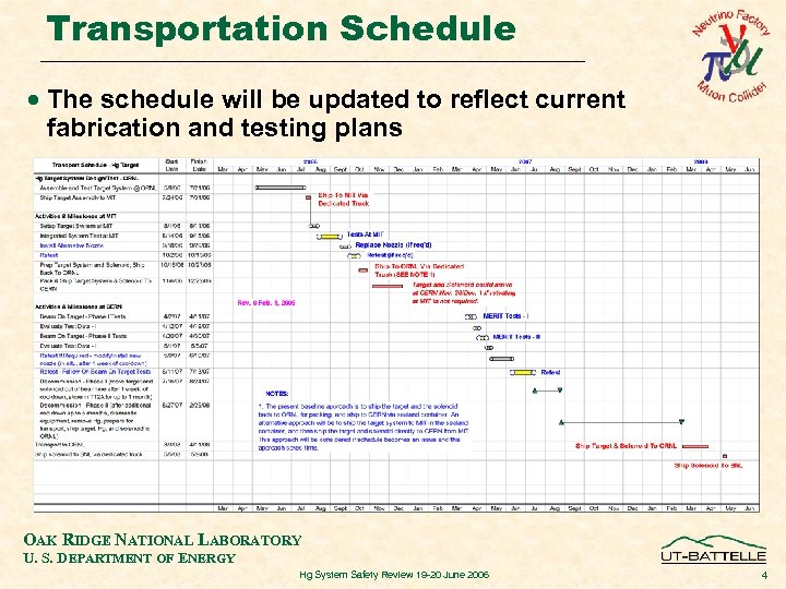Transportation Schedule · The schedule will be updated to reflect current fabrication and testing plans OAK RIDGE NATIONAL LABORATORY U. S. DEPARTMENT OF ENERGY Hg System Safety Review 19 -20 June 2006 4