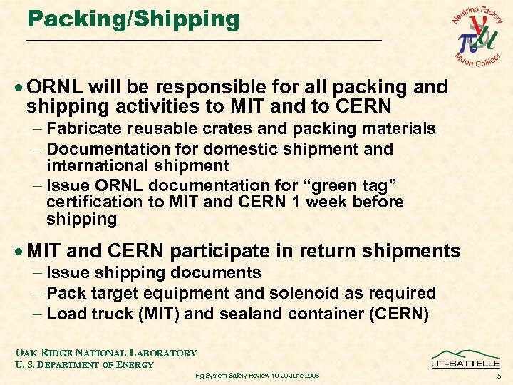 Packing/Shipping · ORNL will be responsible for all packing and shipping activities to MIT and to CERN - Fabricate reusable crates and packing materials - Documentation for domestic shipment and international shipment - Issue ORNL documentation for “green tag” certification to MIT and CERN 1 week before shipping · MIT and CERN participate in return shipments - Issue shipping documents - Pack target equipment and solenoid as required - Load truck (MIT) and sealand container (CERN) OAK RIDGE NATIONAL LABORATORY U. S. DEPARTMENT OF ENERGY Hg System Safety Review 19 -20 June 2006 5