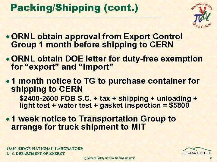 Packing/Shipping (cont. ) · ORNL obtain approval from Export Control Group 1 month before shipping to CERN · ORNL obtain DOE letter for duty-free exemption for “export” and “import” · 1 month notice to TG to purchase container for shipping to CERN - $2400 -2600 FOB S. C. + tax + shipping + unloading + light test + water test + gasket inspection = $5800 · 1 week notice to Transportation Group to arrange for truck shipment to MIT OAK RIDGE NATIONAL LABORATORY U. S. DEPARTMENT OF ENERGY Hg System Safety Review 19 -20 June 2006 6
