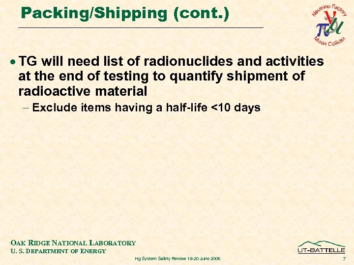 Packing/Shipping (cont. ) · TG will need list of radionuclides and activities at the end of testing to quantify shipment of radioactive material - Exclude items having a half-life <10 days OAK RIDGE NATIONAL LABORATORY U. S. DEPARTMENT OF ENERGY Hg System Safety Review 19 -20 June 2006 7