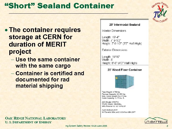 “Short” Sealand Container · The container requires storage at CERN for duration of MERIT project - Use the same container with the same cargo - Container is certified and documented for rad material shipping OAK RIDGE NATIONAL LABORATORY U. S. DEPARTMENT OF ENERGY Hg System Safety Review 19 -20 June 2006 8
