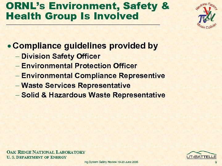 ORNL’s Environment, Safety & Health Group Is Involved · Compliance guidelines provided by - Division Safety Officer - Environmental Protection Officer - Environmental Compliance Representive - Waste Services Representative - Solid & Hazardous Waste Representative OAK RIDGE NATIONAL LABORATORY U. S. DEPARTMENT OF ENERGY Hg System Safety Review 19 -20 June 2006 9