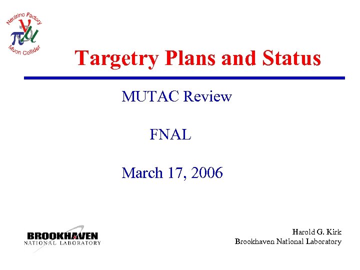 Targetry Plans and Status MUTAC Review FNAL March 17, 2006 Harold G. Kirk Brookhaven National Laboratory