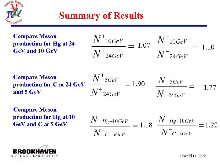 Summary of Results Compare Meson production for Hg at 24 Ge. V and 10 Ge. V Compare Meson production for C at 24 Ge. V and 5 Ge. V Compare Meson production for Hg at 10 Ge. V and C at 5 Ge. V 1. 07 1. 90 1. 18 1. 10 1. 77 1. 22 Harold G. Kirk