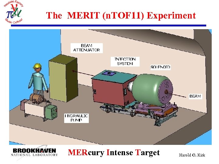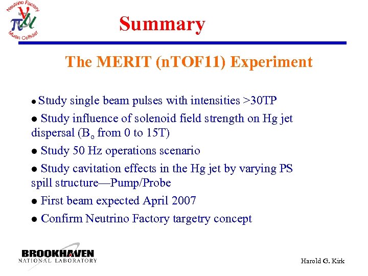 Summary The MERIT (n. TOF 11) Experiment Study single beam pulses with intensities >30 TP l Study influence of solenoid field strength on Hg jet dispersal (Bo from 0 to 15 T) l Study 50 Hz operations scenario l Study cavitation effects in the Hg jet by varying PS spill structure—Pump/Probe l First beam expected April 2007 l Confirm Neutrino Factory targetry concept l Harold G. Kirk