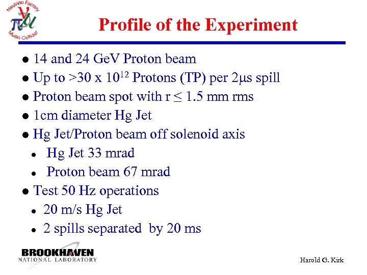 Profile of the Experiment 14 and 24 Ge. V Proton beam l Up to >30 x 1012 Protons (TP) per 2 s spill l Proton beam spot with r ≤ 1. 5 mm rms l 1 cm diameter Hg Jet l Hg Jet/Proton beam off solenoid axis l Hg Jet 33 mrad l Proton beam 67 mrad l Test 50 Hz operations l 20 m/s Hg Jet l 2 spills separated by 20 ms l Harold G. Kirk