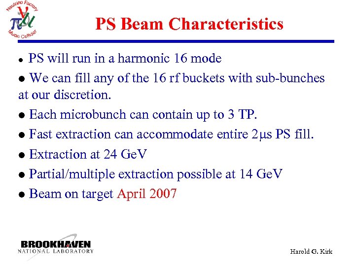 PS Beam Characteristics PS will run in a harmonic 16 mode l We can fill any of the 16 rf buckets with sub-bunches at our discretion. l Each microbunch can contain up to 3 TP. l Fast extraction can accommodate entire 2 s PS fill. l Extraction at 24 Ge. V l Partial/multiple extraction possible at 14 Ge. V l Beam on target April 2007 l Harold G. Kirk