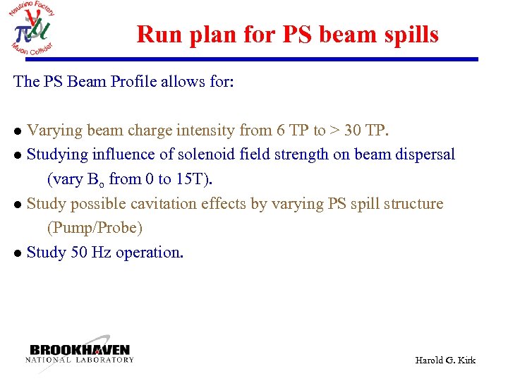 Run plan for PS beam spills The PS Beam Profile allows for: Varying beam charge intensity from 6 TP to > 30 TP. l Studying influence of solenoid field strength on beam dispersal (vary Bo from 0 to 15 T). l Study possible cavitation effects by varying PS spill structure (Pump/Probe) l Study 50 Hz operation. l Harold G. Kirk