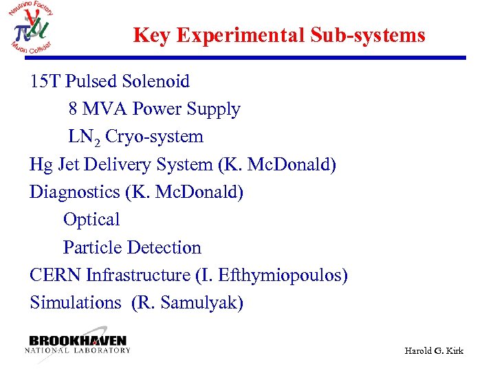 Key Experimental Sub-systems 15 T Pulsed Solenoid 8 MVA Power Supply LN 2 Cryo-system Hg Jet Delivery System (K. Mc. Donald) Diagnostics (K. Mc. Donald) Optical Particle Detection CERN Infrastructure (I. Efthymiopoulos) Simulations (R. Samulyak) Harold G. Kirk