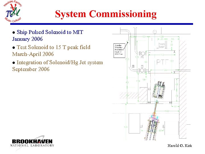 System Commissioning Ship Pulsed Solenoid to MIT January 2006 l Test Solenoid to 15 T peak field March-April 2006 l Integration of Solenoid/Hg Jet system September 2006 l Harold G. Kirk