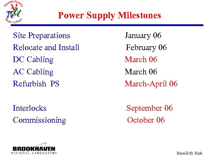 Power Supply Milestones Site Preparations Relocate and Install DC Cabling AC Cabling Refurbish PS January 06 February 06 March-April 06 Interlocks Commissioning September 06 October 06 Harold G. Kirk