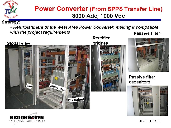 Power Converter (From SPPS Transfer Line) 8000 Adc, 1000 Vdc Strategy: • Refurbishment of the West Area Power Converter, making it compatible with the project requirements Passive filter Rectifier bridges Global view sel f cap Passive filter capacitors acit ors DC output Harold G. Kirk