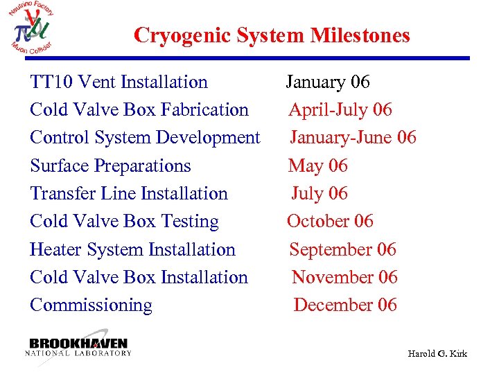 Cryogenic System Milestones TT 10 Vent Installation Cold Valve Box Fabrication Control System Development Surface Preparations Transfer Line Installation Cold Valve Box Testing Heater System Installation Cold Valve Box Installation Commissioning January 06 April-July 06 January-June 06 May 06 July 06 October 06 September 06 November 06 December 06 Harold G. Kirk