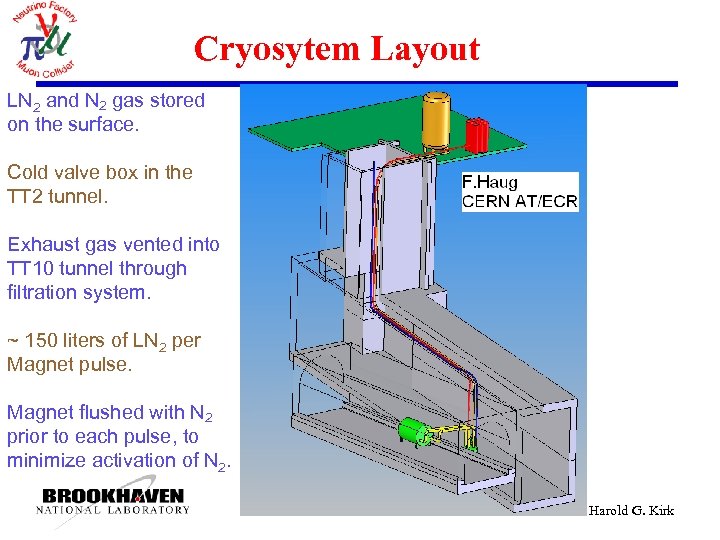Cryosytem Layout LN 2 and N 2 gas stored on the surface. Cold valve box in the TT 2 tunnel. Exhaust gas vented into TT 10 tunnel through filtration system. ~ 150 liters of LN 2 per Magnet pulse. Magnet flushed with N 2 prior to each pulse, to minimize activation of N 2. Harold G. Kirk