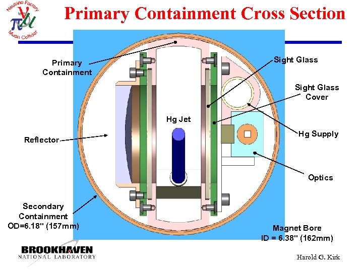 Primary Containment Cross Section Sight Glass Primary Containment Sight Glass Cover Hg Jet Reflector Hg Supply Optics Secondary Containment OD=6. 18" (157 mm) Magnet Bore ID = 6. 38" (162 mm) Harold G. Kirk