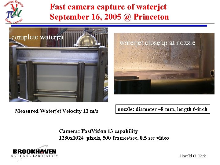 Fast camera capture of waterjet September 16, 2005 @ Princeton complete waterjet Measured Waterjet Velocity 12 m/s waterjet closeup at nozzle: diameter ~8 mm, length 6 -inch Camera: Fast. Vision 13 capability 1280 x 1024 pixels, 500 frames/sec, 0. 5 sec video close-up view of nozzle Harold G. Kirk