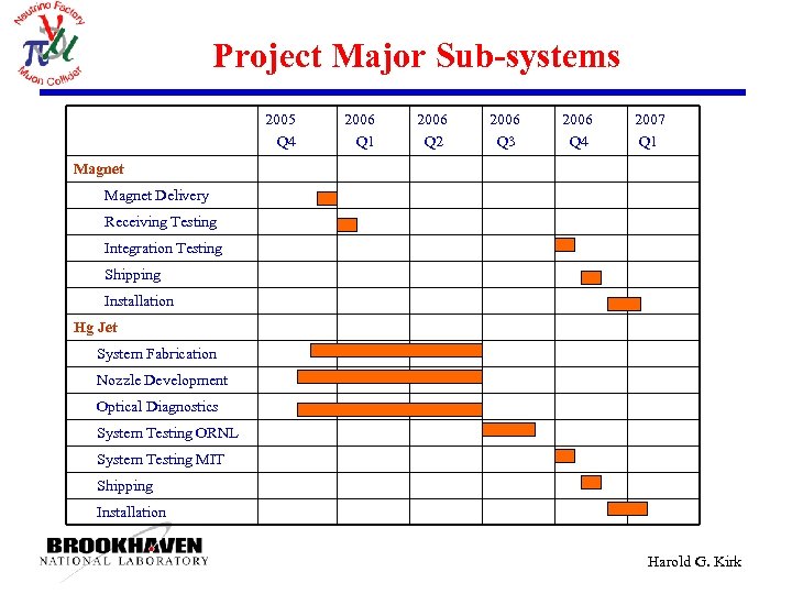 Project Major Sub-systems 2005 Q 4 2006 Q 1 2006 Q 2 2006 Q 3 2006 Q 4 2007 Q 1 Magnet Delivery Receiving Testing Integration Testing Shipping Installation Hg Jet System Fabrication Nozzle Development Optical Diagnostics System Testing ORNL System Testing MIT Shipping Installation Harold G. Kirk