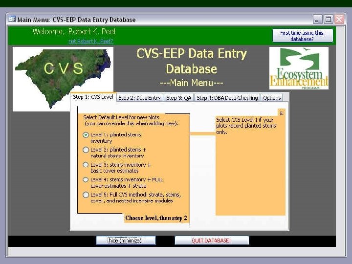 • Trade off between detail and time. • EEP protocol seamlessly integrates with CVS methods by allowing a series of sampling levels. • MS-Access data-entry tool to assure standardize data, easy assimilation, and automated quality control. • Standard backend database for reports and analysis